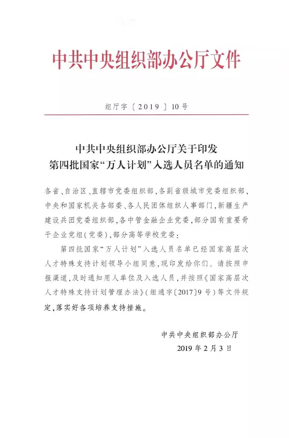 国家高层次人才特殊支持计划,简称“国家特支计划”,亦称国家“万人计划”,是面向国内高层次人才的支持计划。2012年8月17日,经党中央、国务院领导批准,由中组部、人社部等11个部门和单位联合印发。目标是用10年时间,遂选1万名左右自然科学、工程技术和哲学社会科学领域的杰出人オ、领军人才和青年拔尖人才,给予特殊支持。 ![]() “万人计划”按照高端引领、梯次配置的思路,重点支持三个层次、七类人才。第一个层次是“杰出人才”,计划支持100名处于世界科技前沿领域、科学研究有重大发现、具有成长为世界级科学家潜力的人才。第二个层次是“领军人才”,计划支持8000名国家科技发展和产业发展急需紧缺的创新创业人才,包括科技创新领军人才、科技创业领军人才、哲学社会科学领军人才、教学名师和百千万工程领军人才等类别。第三个层次是“青年拔尖人才”,计划支持2000名35周岁以下、具有特别优秀的科学研究和技术创新潜能、科研工作有重要创新前景的青年人才。 |